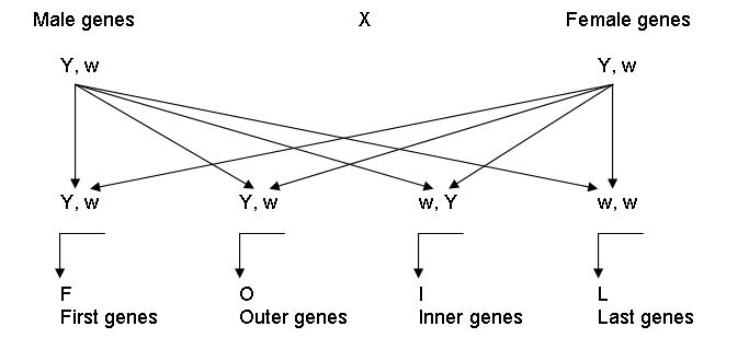 Law 2: The Fission Law. This law is also called the Law of Segregation. Simply stated it is based on the fact that genes exist in pairs in the cells of an individual, and the members of a gene pair separate into the reproductive or sex cells (also called Gametes) formed by that individual, such that half carry one member of the gene pair and half carry the other. If two pigeons that appear the same are paired, they will transfer their traits to the F2 generation (their grand children) in a particular ratio, and the chromosomes of the grand parents determine this ratio. If we were to pair the offspring of the yellow- and white eyed pigeons, their children (F2 generation) will display yellow versus white eyes in the following ratio: ¼ white, ¾ yellow. This is assuming that two of the yellow-eyed offspring will be pure yellow (homozygote) and one will be a mixture of yellow and white genes, though appearing yellow (heterozygote). (A pigeon that has matching alleles at a locus, e.g. YY or ww, is called homozygous. A pigeon that has two different alleles at a locus, e.g. Yw, is called heterozygous.)